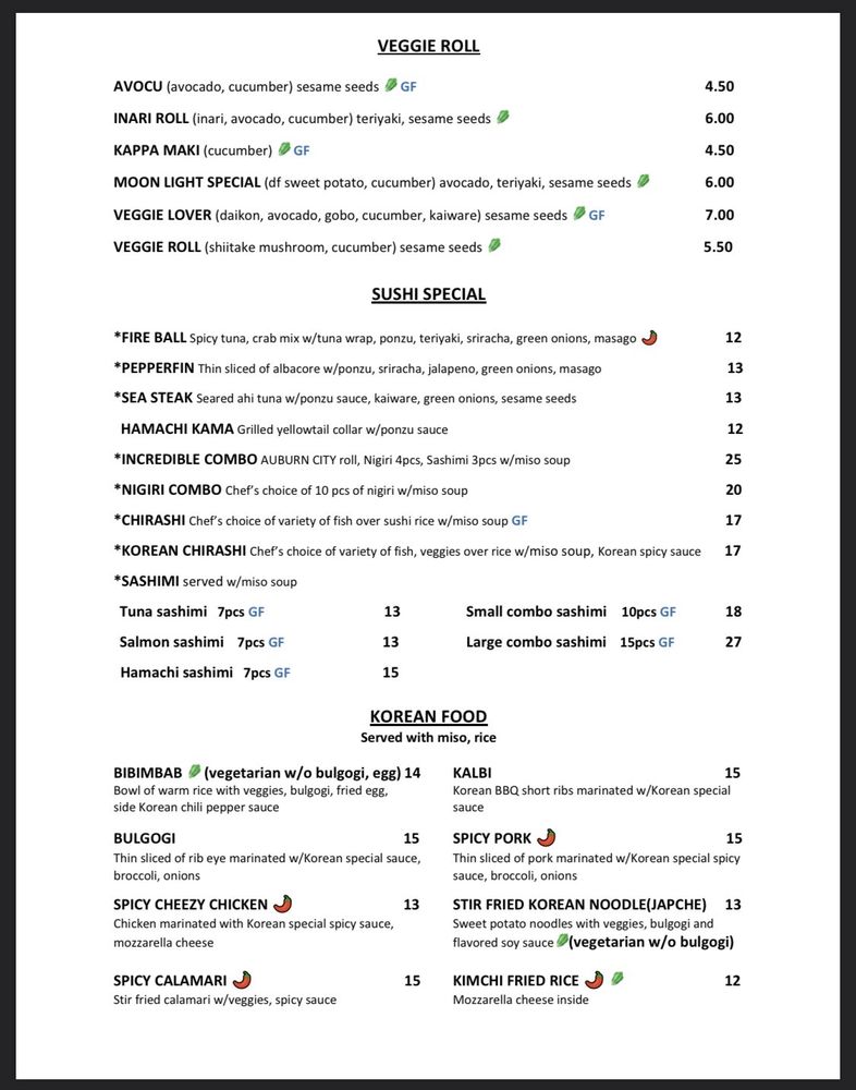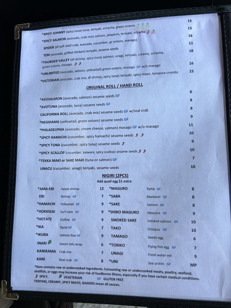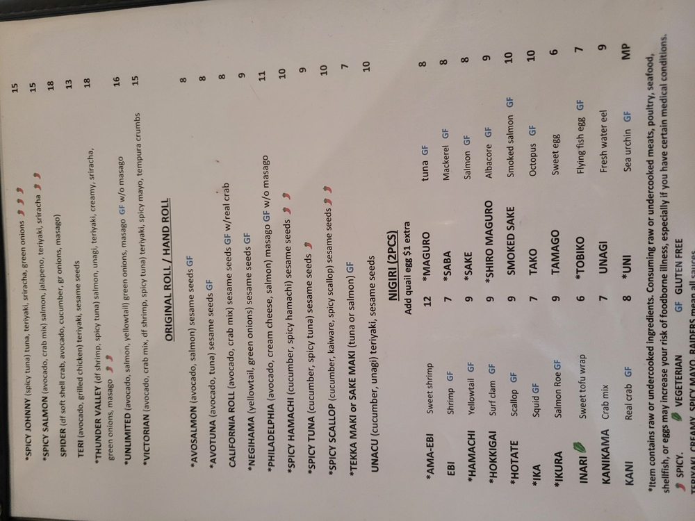 house roll, nigiri, sashimi.Item contains raw or undercooked ingredients. Consuming raw or undercooked meats,poultry, seafood, shellfish, or eggs may increase your risk of foodborne illness, especially if youhave certain medical conditions.